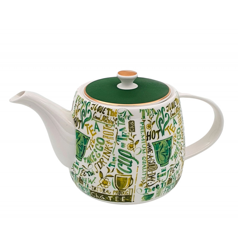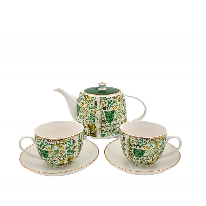 El juego consta de tetera y tapa, dos tazas y dos platos.