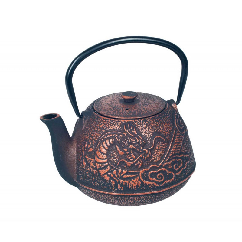 Tetera de hierro fundido con decoraciones negro y cobre.