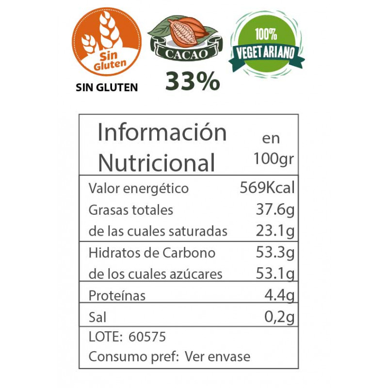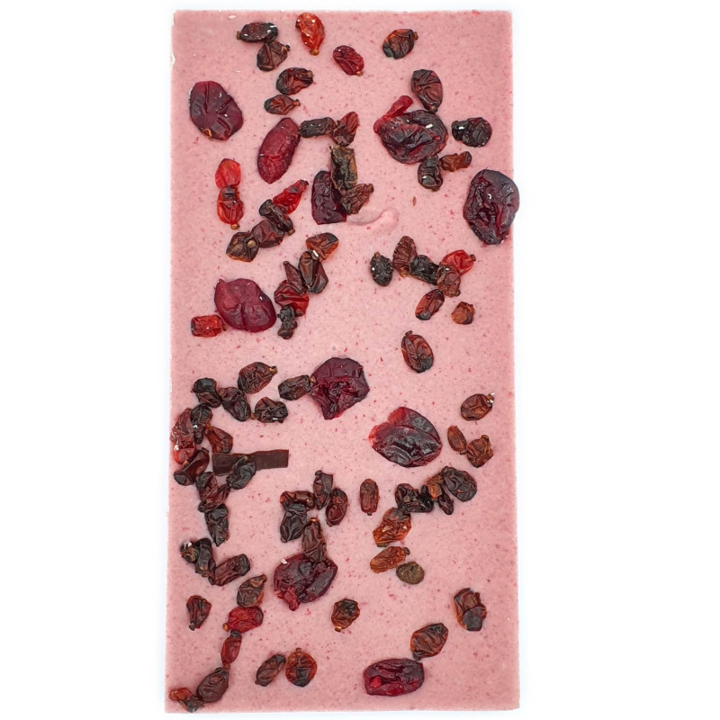 Tableta de 100gr chocolate blanco con un contenido de cacao del 33% mezclado con frutos rojos deshidratados, el dulzor del chocolate enfatiza el delicioso sabor fresco de los frutros rojos.