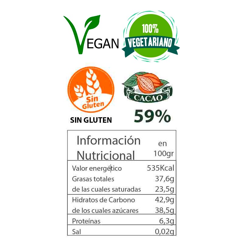 Tableta de 100gr chocolate con un contenido de cacao del 59% de origen venezolano combinado con pequeños trozos de naranjas ecológicas que le dan un sabor redondo y armónico.