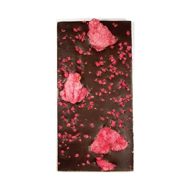 Tableta de 100gr de chocolate con un 70% de cacao proveniente de América del Sur combinado con sutiles pétalos de rosa confitados y aceite de rosa inglés natural.