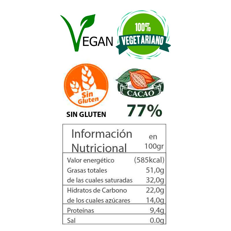 Chocolate artesano con un porcentaje de cacao del 77% proveniente de los mejores cultivos de Venezuela.