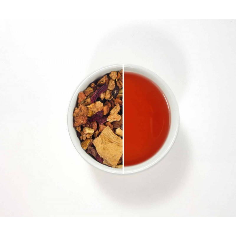 Summer Spritz es una infusión vibrante y afrutada que combina trozos de manzana, hibisco, remolacha, mango, hojas de mora, cáscara de naranja, flores de aciano y un delicado toque de aceite de maracuyá liofilizado. Su aroma tropical y floral recuerda a un cóctel veraniego sin alcohol, ideal para refrescar cuerpo y mente.