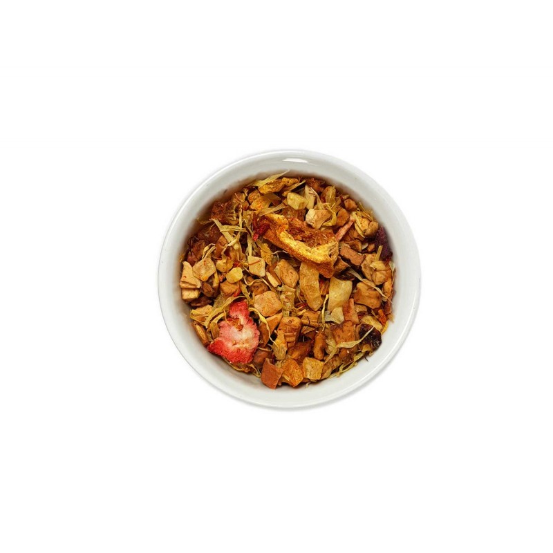 La variedad de Infusión Mango Tango está compuesta por Trozos de Piña, mango y manzana, laminas de piña, laminas de mango, rodajas de naranja y mandarina, petalos de cártamo, flores de caléndula, rodajas de fresa. Esta infución de sabor a dulce y tropical gracias a que está compuesta por fruta de primara calida, puede ser consumida tanto fría como caliente.