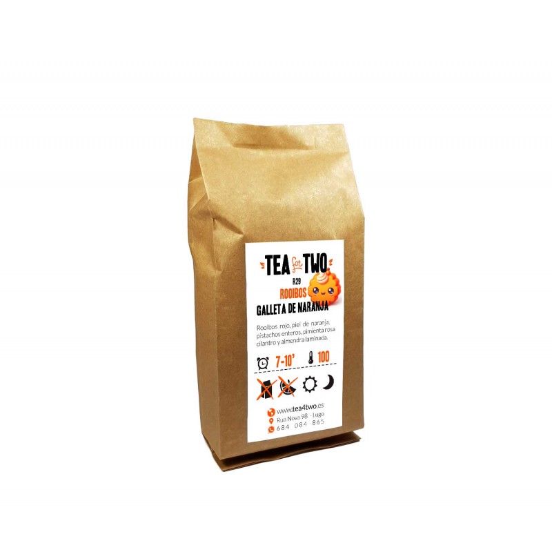 La infusión de Rooibos Galleta de naranja de sabor especiado y dulce, con un toque ligeramente picante. Puede tomarse a cualquier hora del día gracias a carecer de teína. Puede ser consumido tanto por niños como por mayores, así como también por personas sensibles a la cafeína. Destacan de él sus propiedades relajantes, así como también por sus efectos desintoxicantes y digestivos. Se puede infusionar directamente en leche si se desea. Será la bebida ideal para tomar en noches frías o tardes lluviosas.