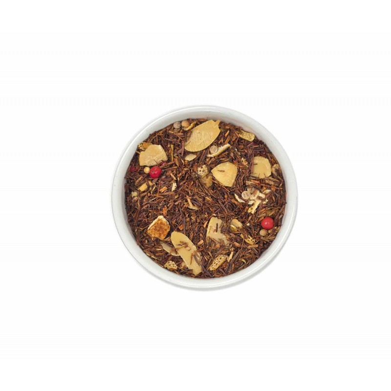 La variedad de Rooibos Galleta de naranja está compuesto por rooibos rojo, pistachos enteros, piel de naranja, laminas de almendra, pimienta rosa y cilantro.