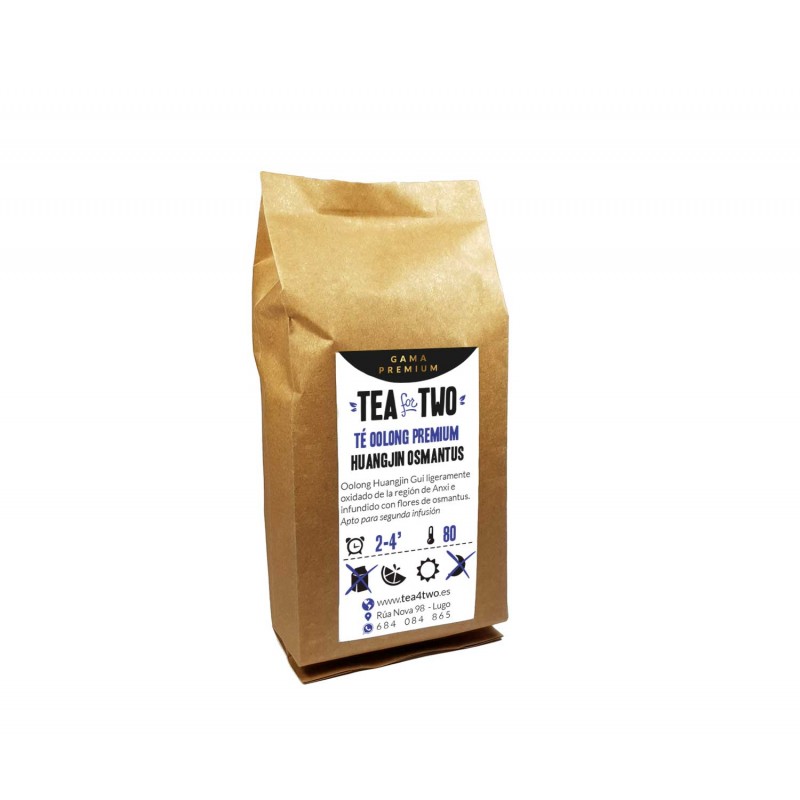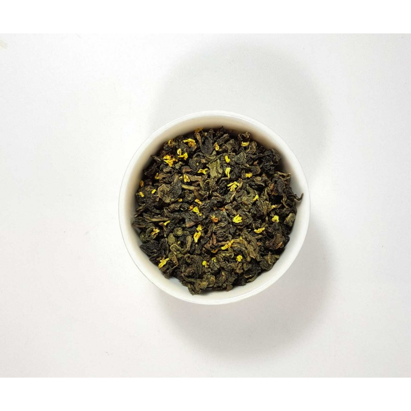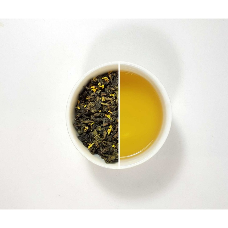 La variedad de Oolong Huangjin Osmantus está compuesta por té oolong semioxidado de la región de Anxi y flores de osmantus.