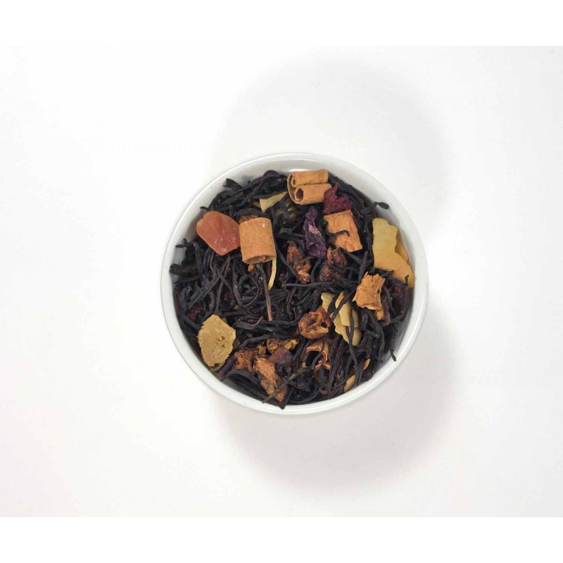 Gracias a su base de té negro, esta infusión contiene teína, lo que la convierte en una excelente opción para comenzar el día con energía. Los ingredientes frutales y especiados aportan una sensación de confort y dulzura natural, ideal para reconectar con los sentidos. Es perfecto para acompañar momentos de calma o para compartir en reuniones especiales.