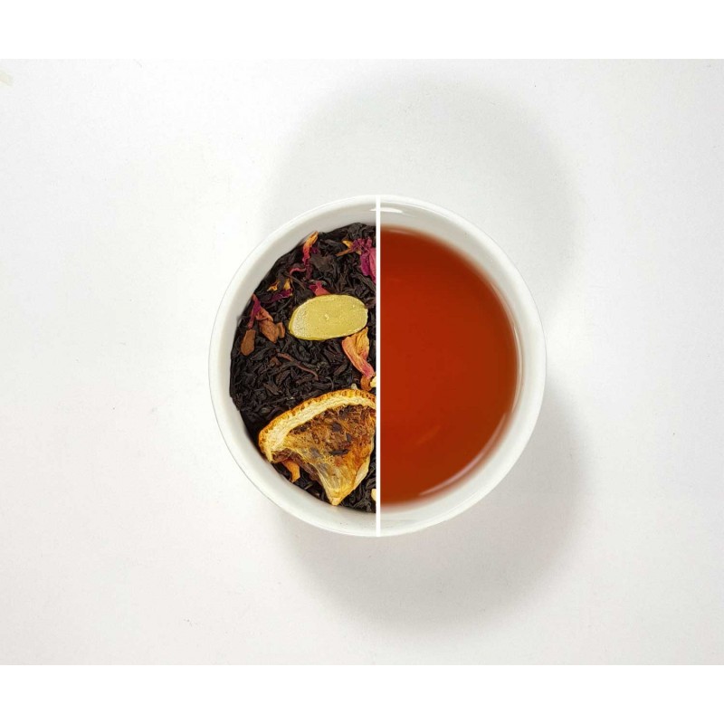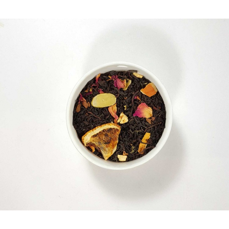 El Té Negro Naranja Canela Natural es una deliciosa bebida compuesta por té negro assámico de Ceylan, cáscaras de naranja, trozos de canela, trozos de almendra, pétalos de rosa, aroma natural, esquinas de naranja y astillas de canela.