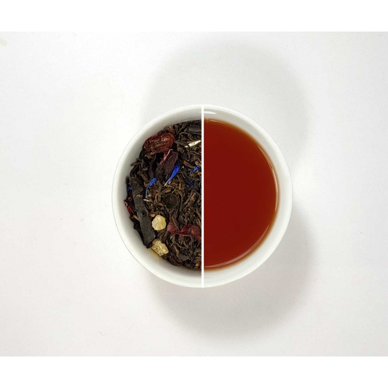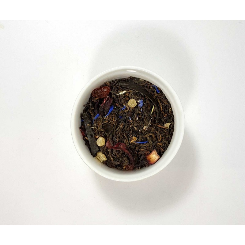El Pu Erh Adelgazante es una mezcla de té rojo pu erh, trozos de piña, ciruela, alga fucus, hibisco, escaramujo y pétalos de aciano.