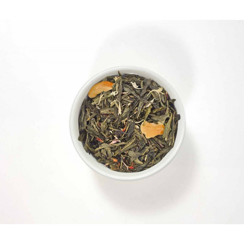 Esta mezcla contiene té verde sencha de alta calidad, escaramujo liofilizado con su característica acidez suave, trocitos de cereza agria que aportan un toque vivaz, granulado de maracuyá para un matiz tropical exótico, pétalos de cártamo y flores de aciano que embellecen la infusión y elevan la experiencia sensorial con sus notas florales sutiles.