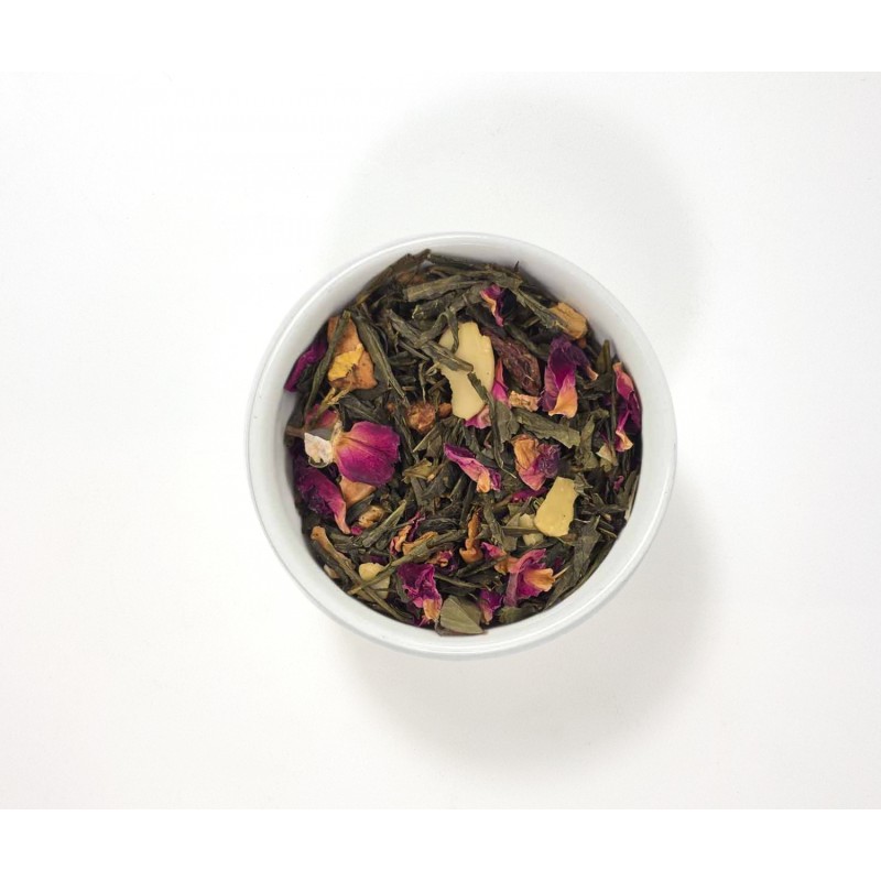 Compuesto de Té verde Sencha, trozos de manzana, pétalos de rosa, uvas pasas y trozos de almendra.